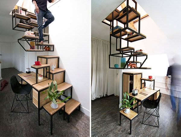 荷蘭設(shè)計(jì)師Mieke Meijer打造了一個(gè)具有儲物功能的樓梯。這個(gè)樓梯分兩個(gè)部分,上部高低兩排的懸浮鏤空結(jié)構(gòu)使其在具備儲物功能的同時(shí)也方便行走,而下部由儲物柜和辦公桌組成。這樣的設(shè)計(jì)方式在考慮樓梯自身功能的同時(shí),也有效的利用了空間。